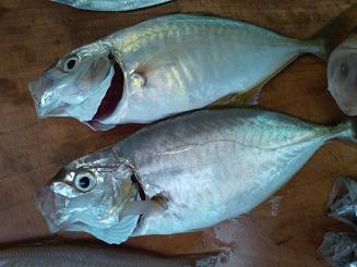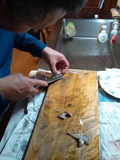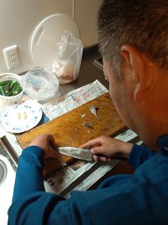 社長は釣ってきた「アジ」を調理中。 |
