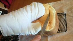 あんまり膨らみすぎて、パンの頭が押し付けられてへこんでいます。