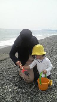 海辺に貝を拾いに出かけたようです。